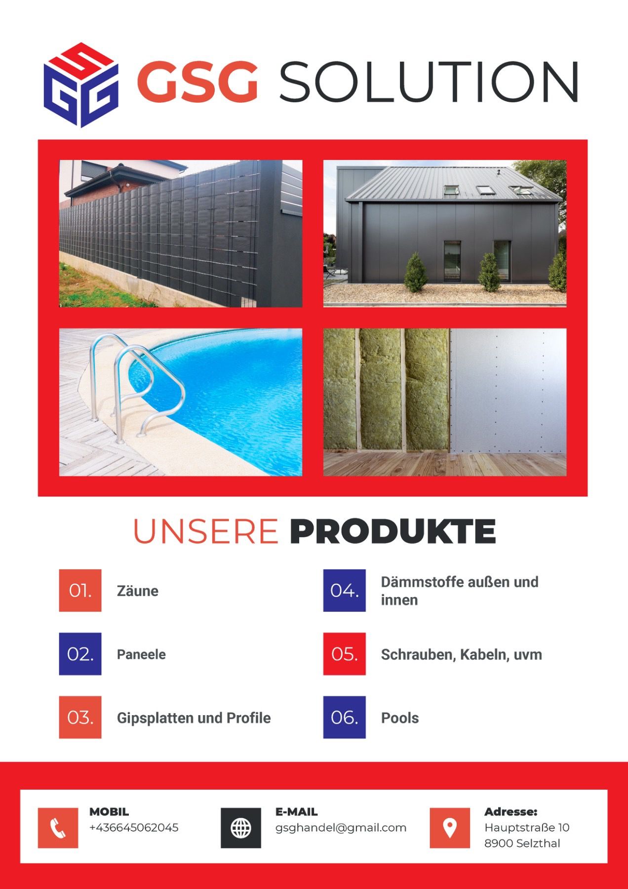 Baustoffhandel und Montage von Zäunen, Paneelen, Pools, Fasssaunas, Gipsplatten, Profilen, Dämmstoffen (außen und innen), Schrauben, Kabeln uvm.