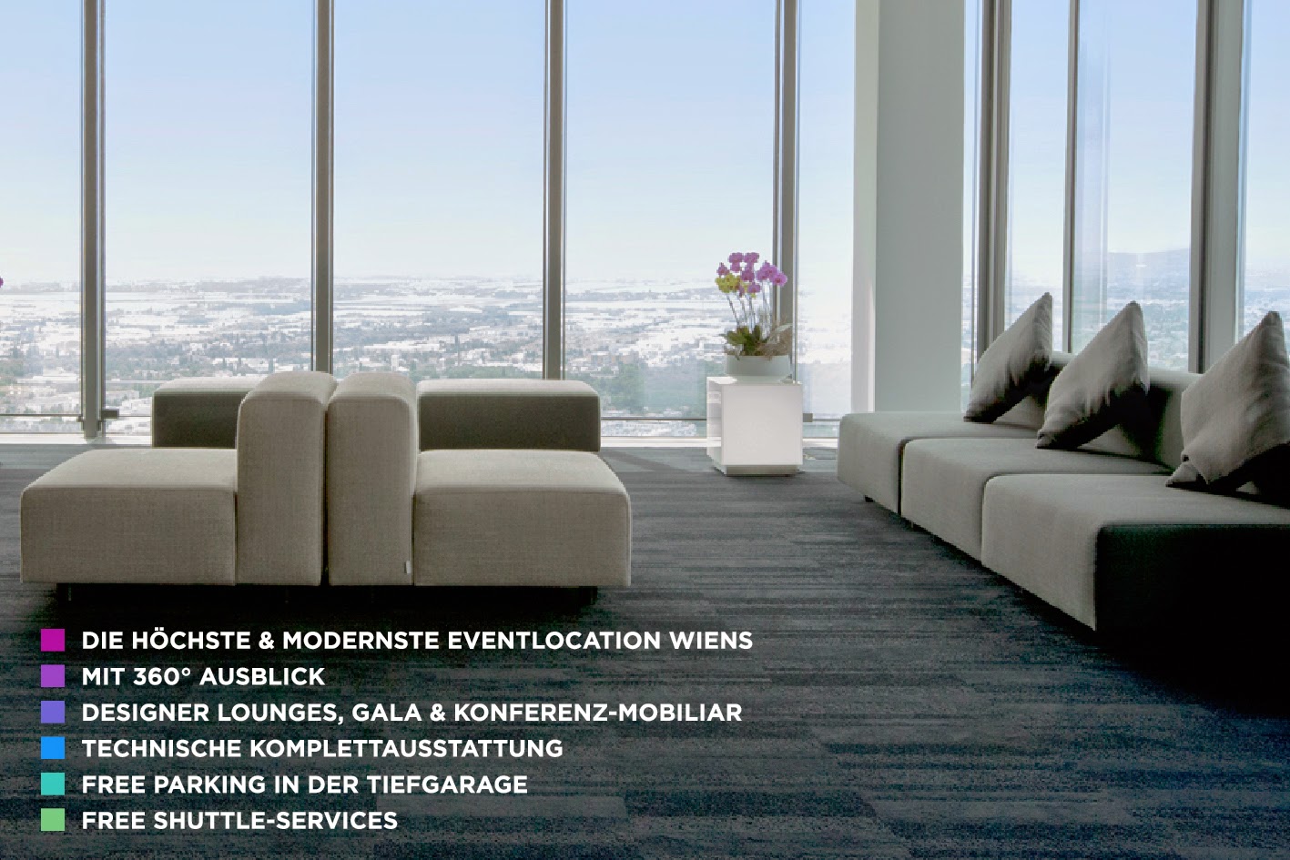 Das ThirtyFive ist der ideale Ort, für die Umsetzung außergewöhnlicher Eventkonzepte. Ein Raum, der jeden Augenblick zu einem besonderen Moment macht. Mit einem atemberaubenden Panoramablick aus der 35. Etage erwarten Sie unvergessliche Event-Momente und 5*Sterne Service.