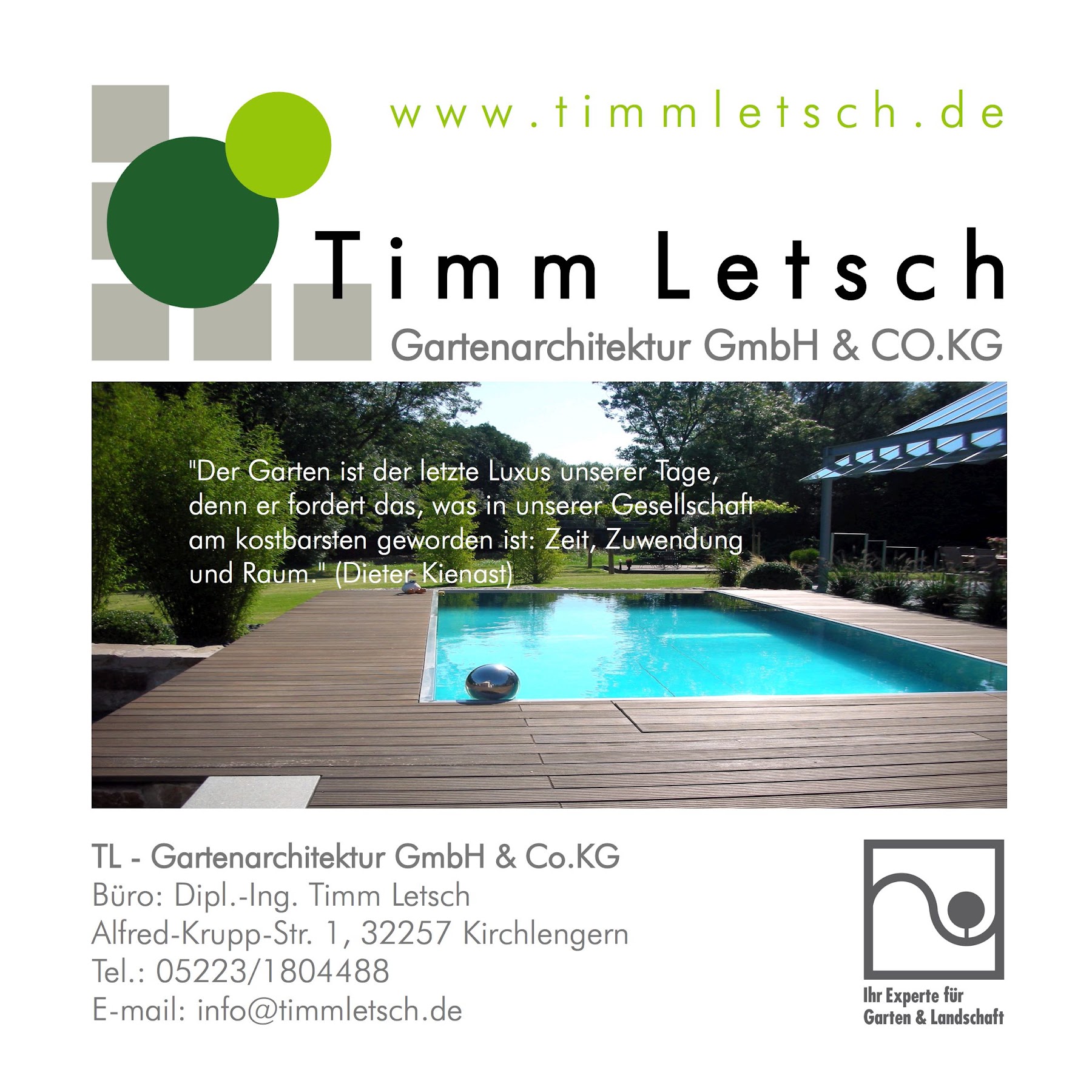 Sie suchen ein professionelles Garten- und Landschaftsbau-Team in der Region Bünde? Dann sind Sie bei der Timm Letsch Gartenarchitektur GmbH & Co. KG genau richtig. Von der ersten Idee über die exakte Planung bis zur Realisierung Ihrer Garten- und Grünanlagenträume sind wir an Ihrer Seite! Wir freuen uns auf Ihr Projekt!